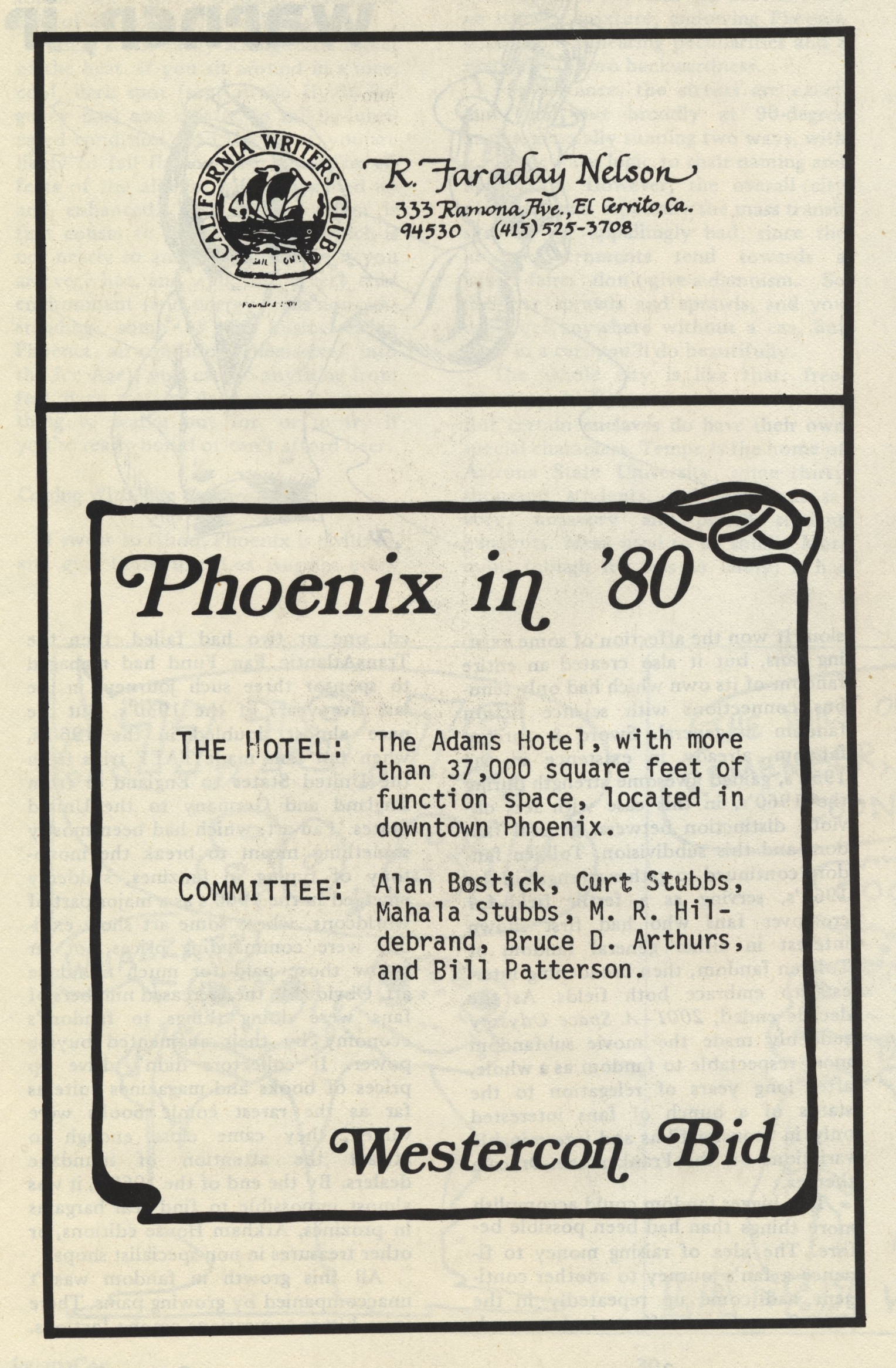 | 1980 | Westercon | 33 | Phoenix | Los Angeles, CA | ||